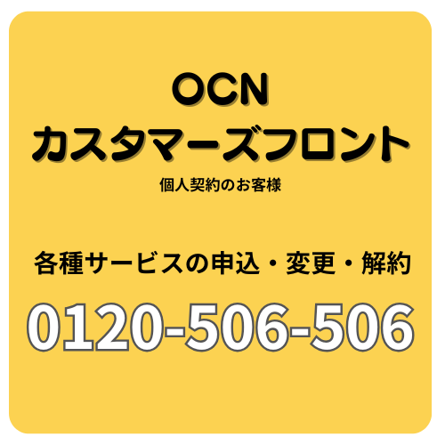OCNカスタマーズフロント(総合窓口)解約・契約内容の確認・変更0120-506-506解約、契約内容確認、名義変更、住所変更